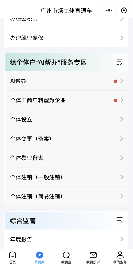 2.手机端。通过微信小程序搜索“广州市场主体直通车”或识别下图二维码进入“广州市场主体直通车”小程序,点击“我要办”,找到“穗个体户‘AI帮办’服务专区”,选择对应的个体业务进行个体登记业务申请。